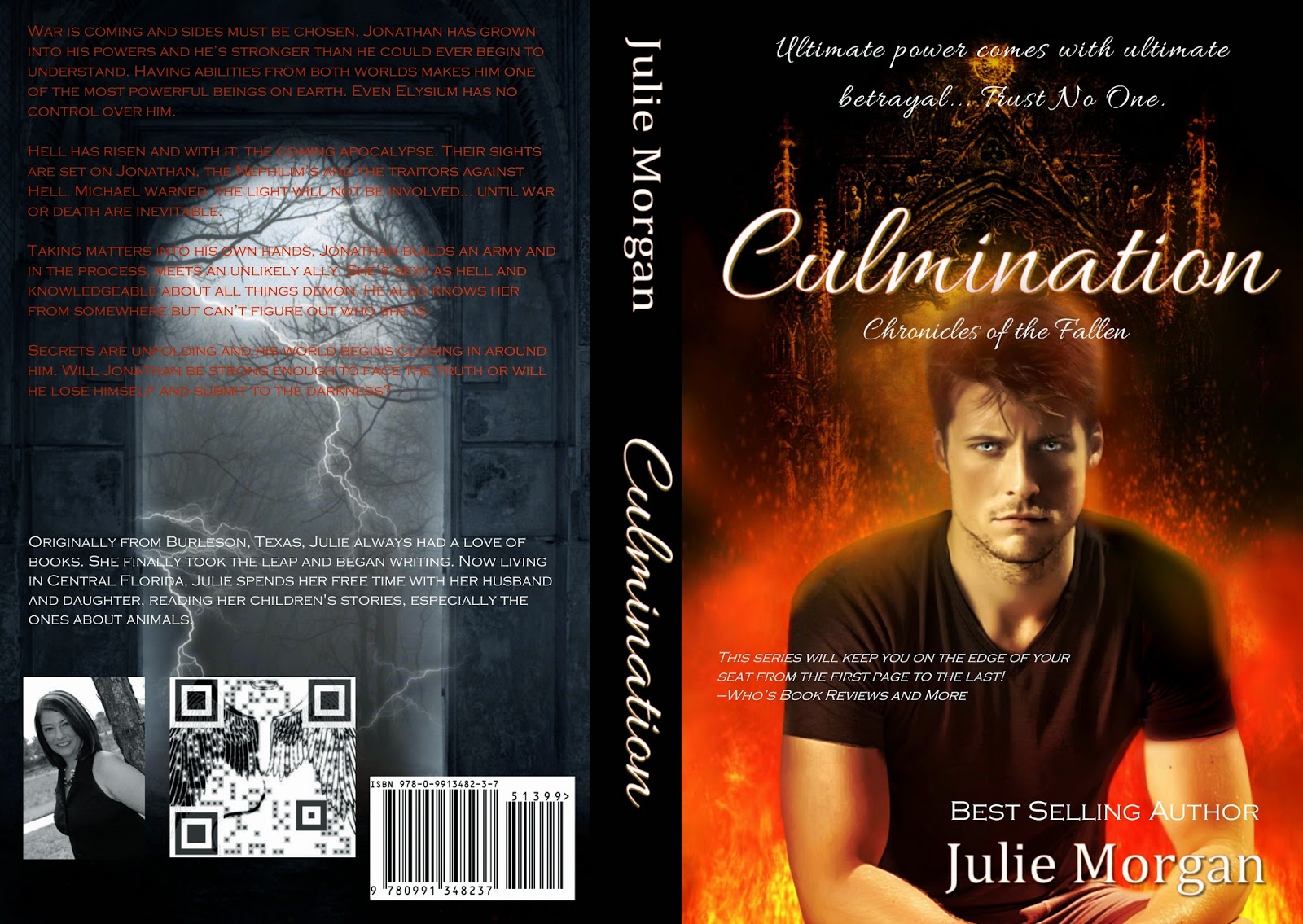 Fallen http://www.amazon.com/dp/B00H1EMU88/ Redemption http://www.amazon.com/dp/B00IZPYPFS/ Atonement http://www.amazon.com/dp/B00KAQ6Y2W/ Culmination: Ultimate power comes with ultimate betrayal. Trust No One. War is coming and sides must be chosen. Jonathan has grown into his powers and he’s stronger than he could ever begin to understand. Having abilities from both worlds makes him one of the most powerful beings on earth. Even Elysium has no control over him. Hell has risen and with it, the coming apocalypse. Their sights are set on Jonathan, the Nephilim’s and the traitors against Hell. Michael warned the light will not be involved… until war or death are inevitable. Taking matters into his own hands, Jonathan builds an army and in the process, meets an unlikely ally. She’s sexy as hell and knowledgeable about all things demon. He also knows her from somewhere but can’t figure out who she is. Secrets are unfolding and his world begins closing in around him. Will Jonathan be strong enough to face the truth or will he lose himself and submit to the darkness? Chronicles of the Fallen has been a wild ride! In a years time, the story had been outlined and written into four different stories, each detailing a different aspect of the series.